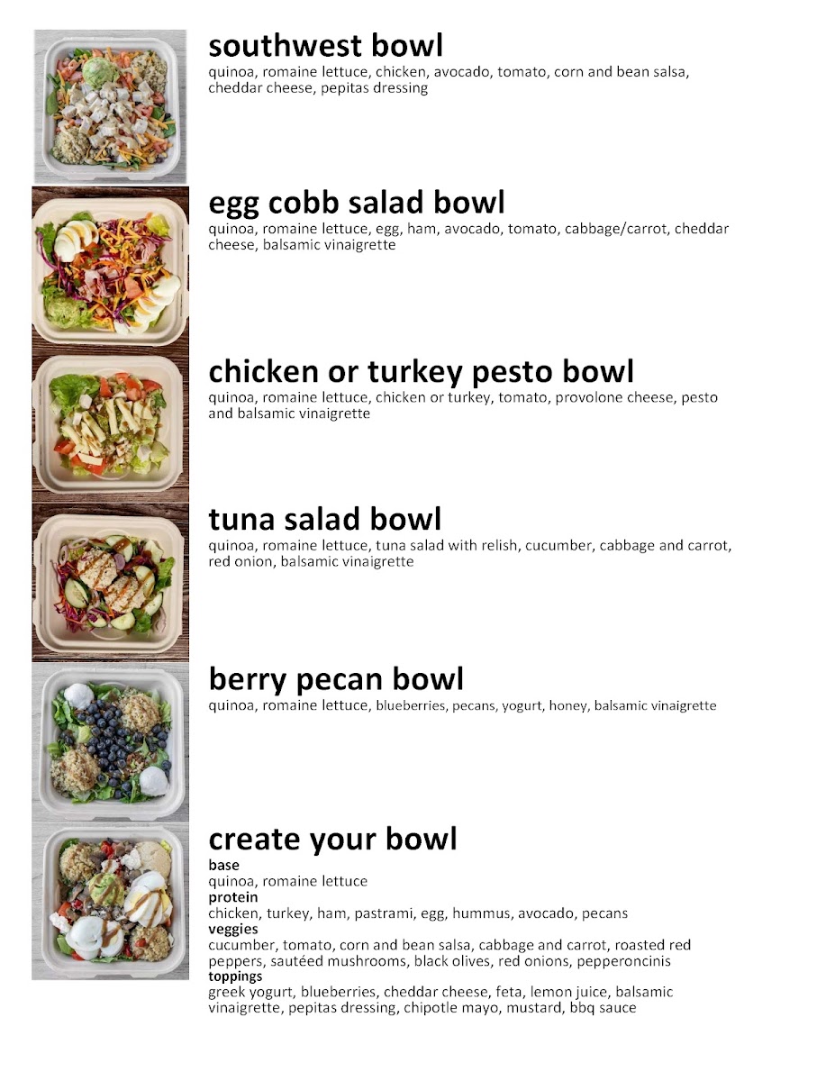 Quinoa, romaine lettuce, egg, ham, avocado, tomato, cabbage/carrot, cheddar cheese and balsamic vinaigrette.